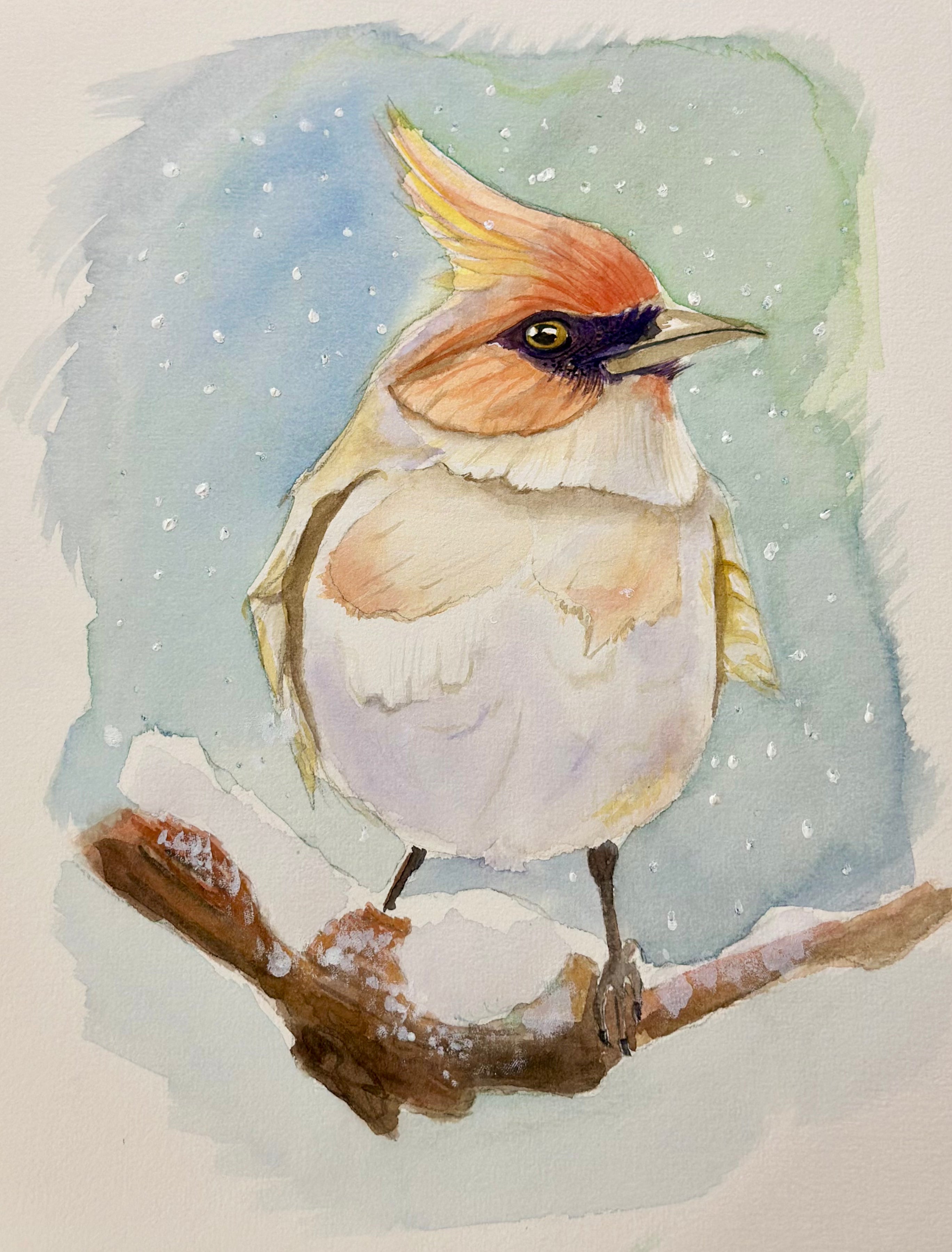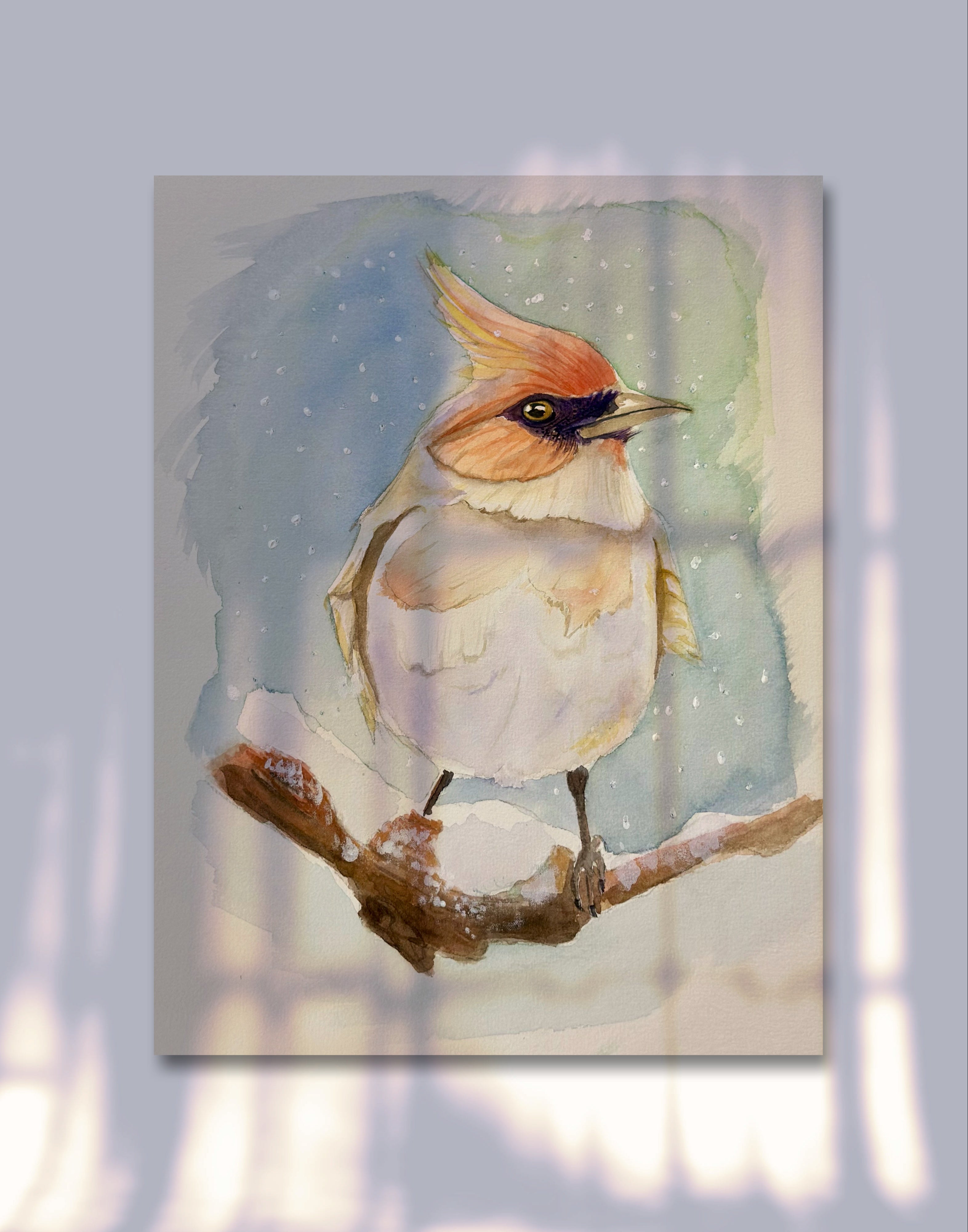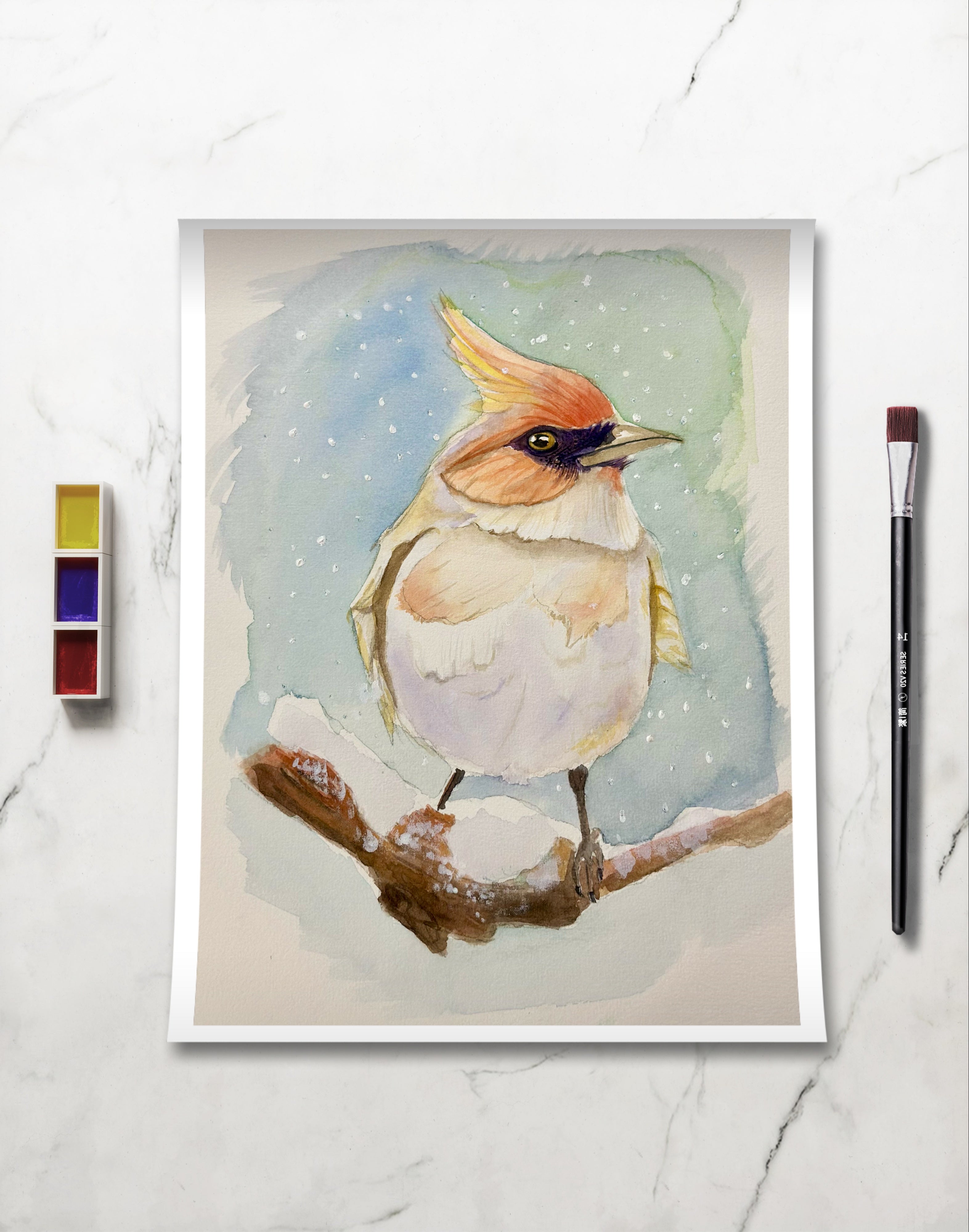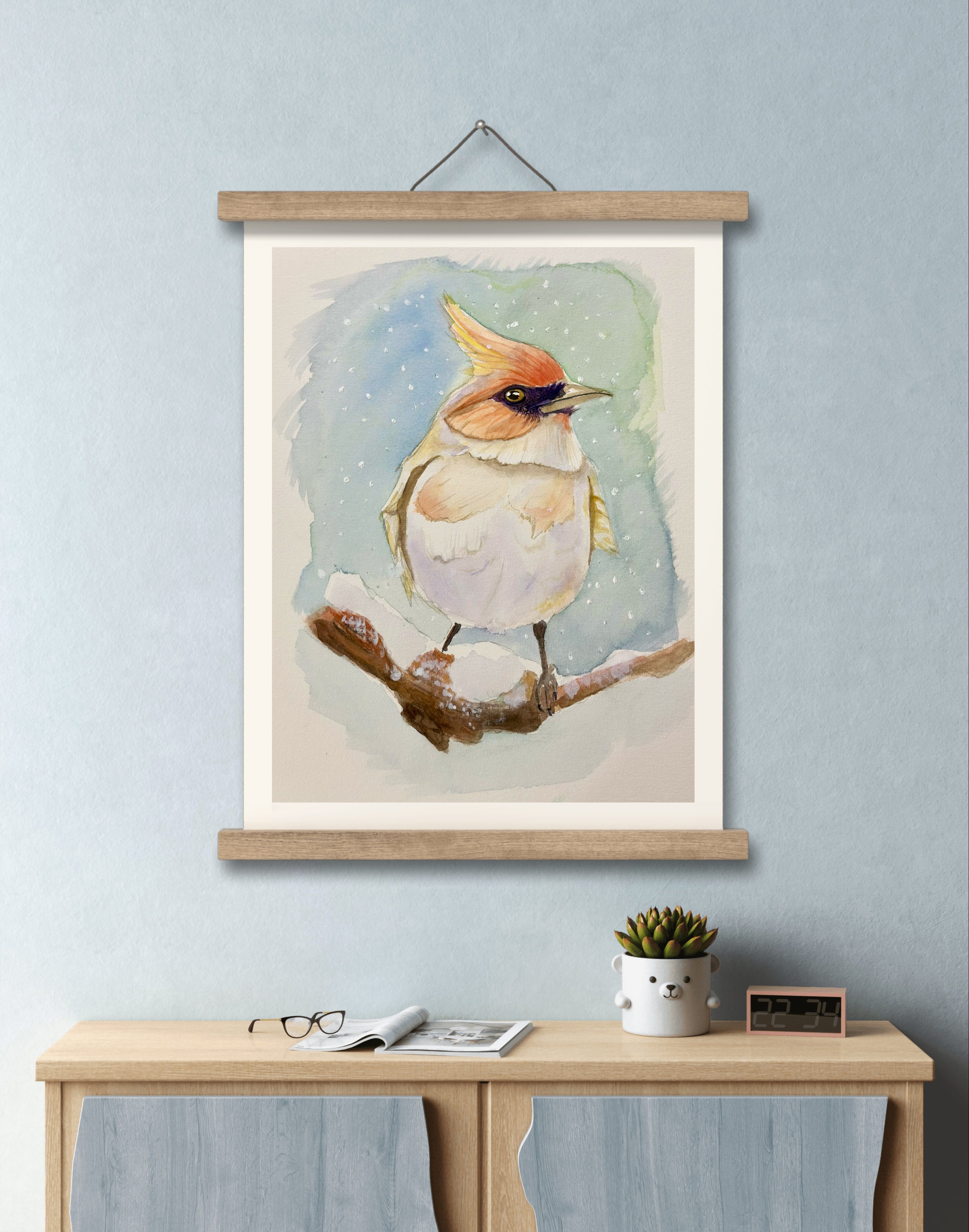 This winter bird print features a stunning rendition of an original watercolor painting. A beautiful addition to any home decor, this piece captures the essence of the season in a unique and artistic way. Bring the beauty of nature indoors with this winter bird print.