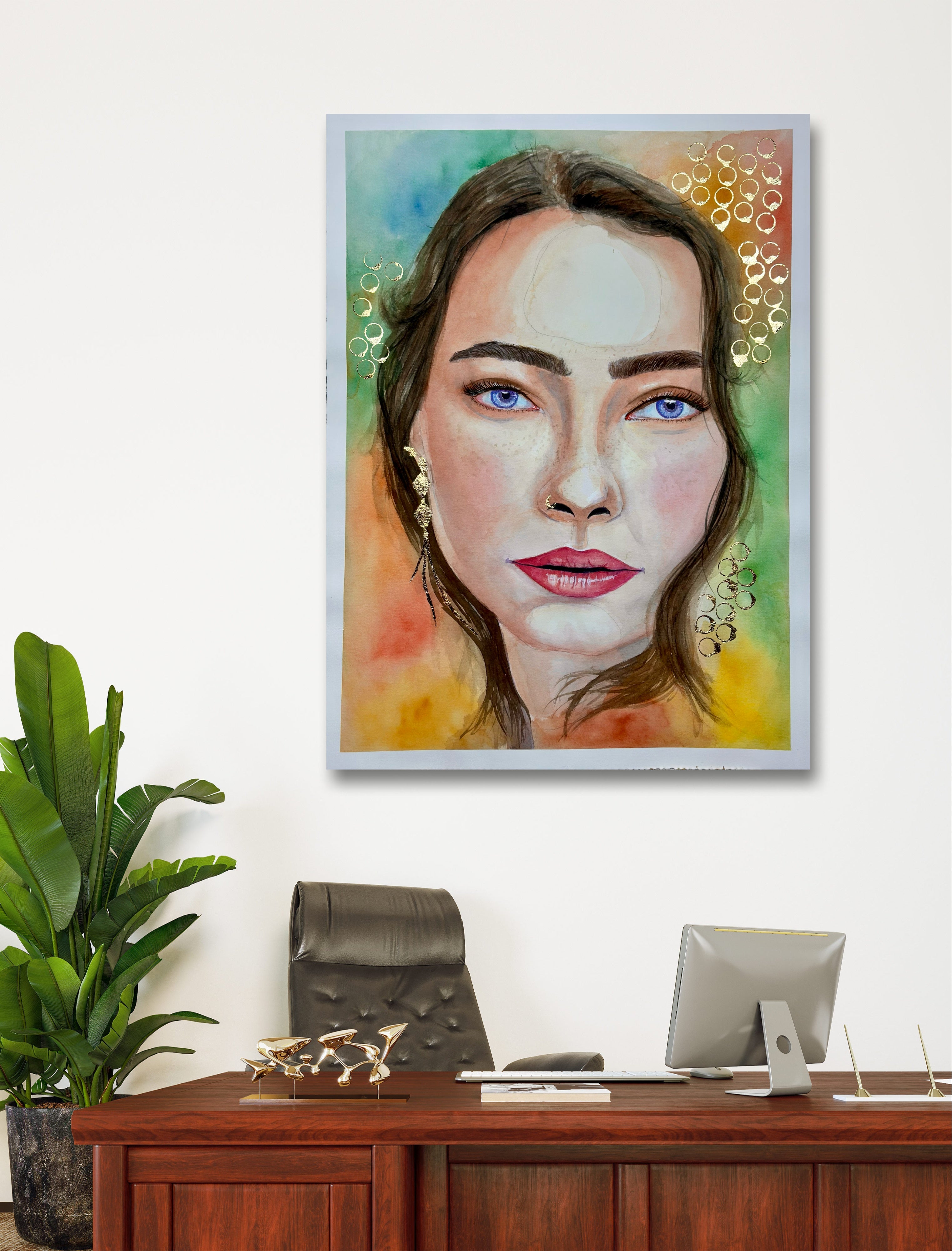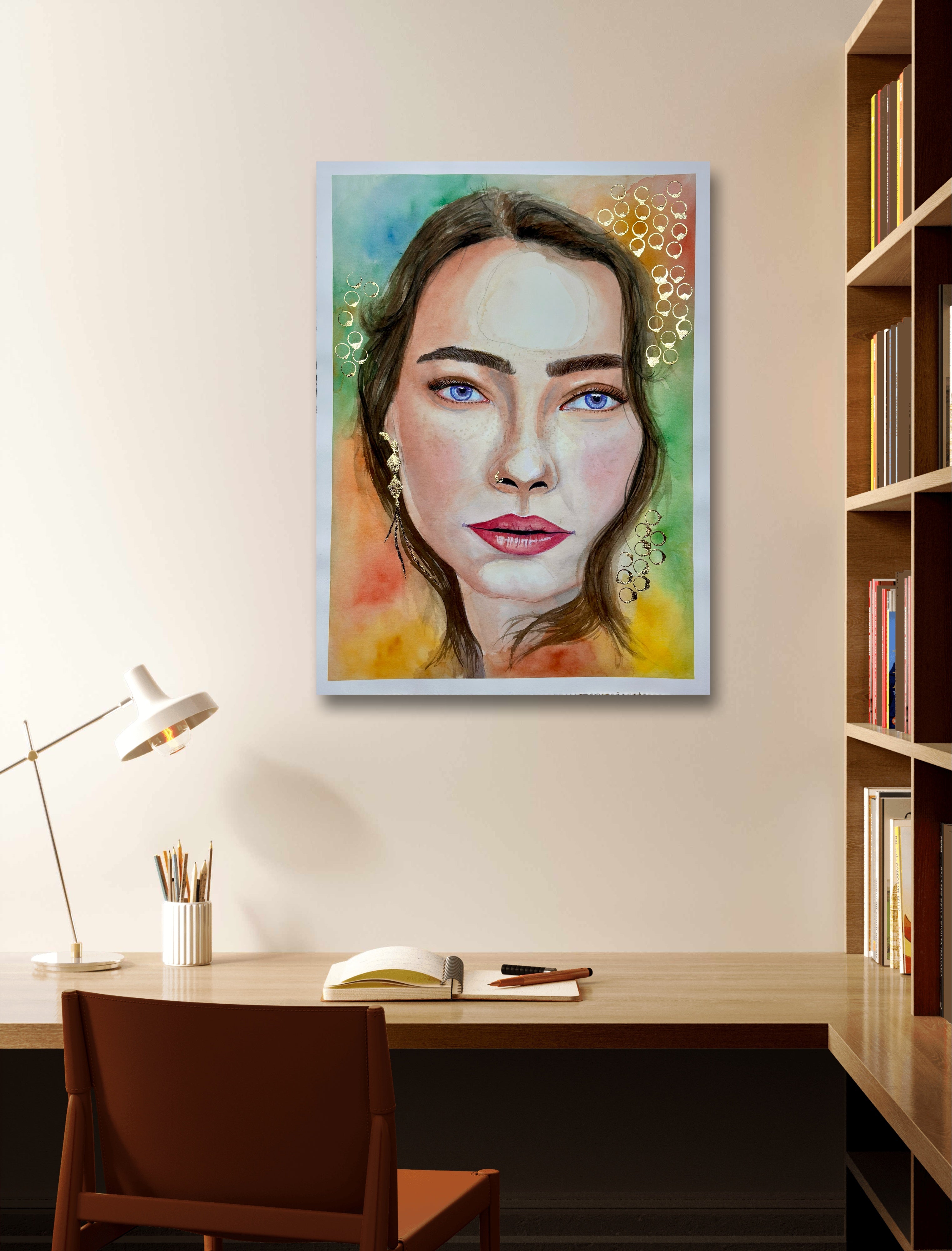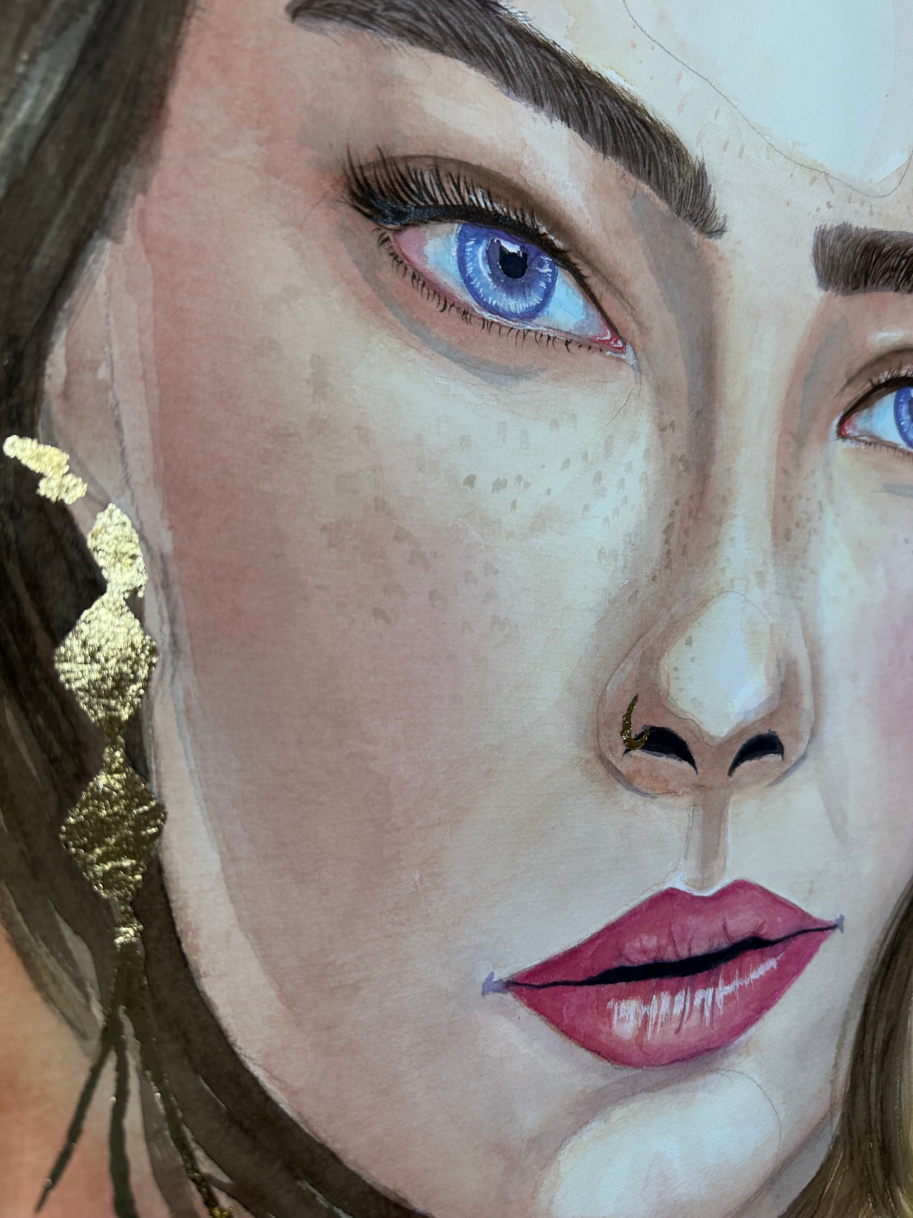 What sets this artwork apart is the addition of opulent gold leaves, carefully applied as embellishments. These gilded accents elevate the piece, casting a luminous glow that enhances the overall allure. The interplay between the rich watercolor palette and the shimmering gold creates a captivating juxtaposition, adding a touch of elegance and luxury to the composition.
