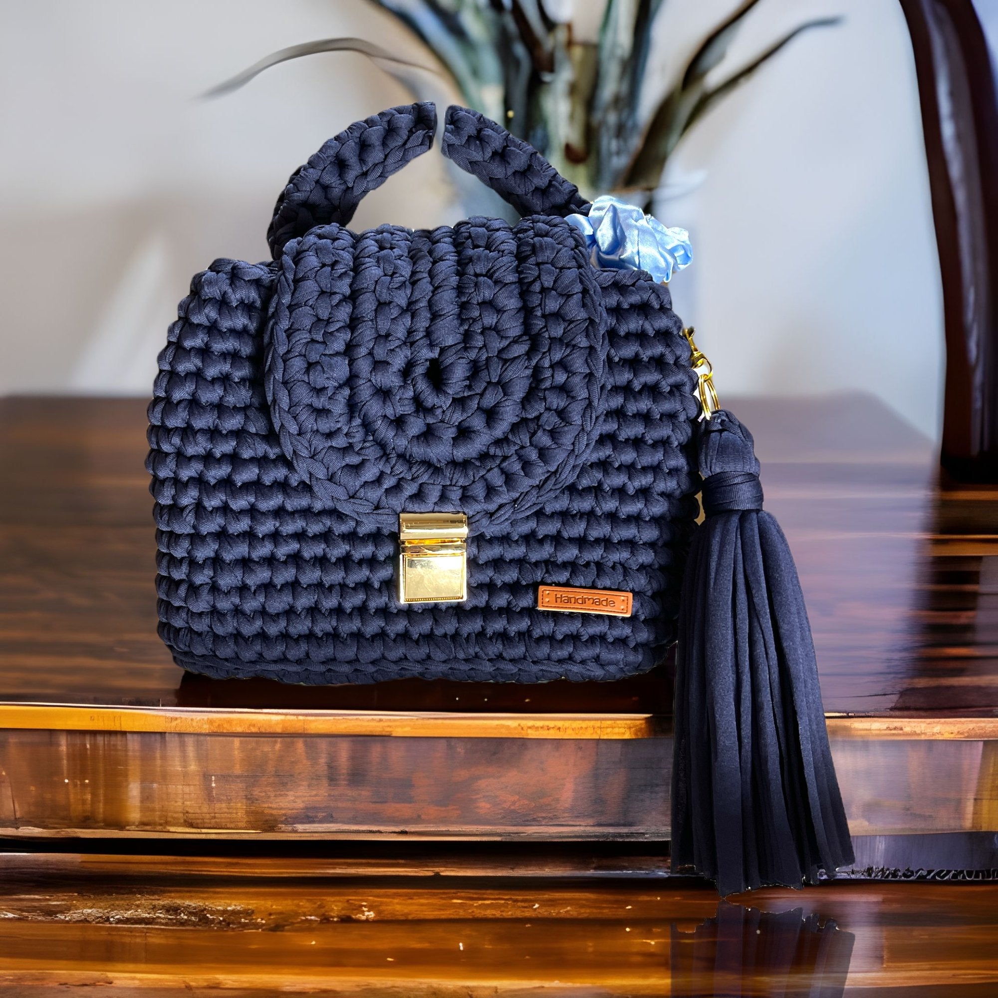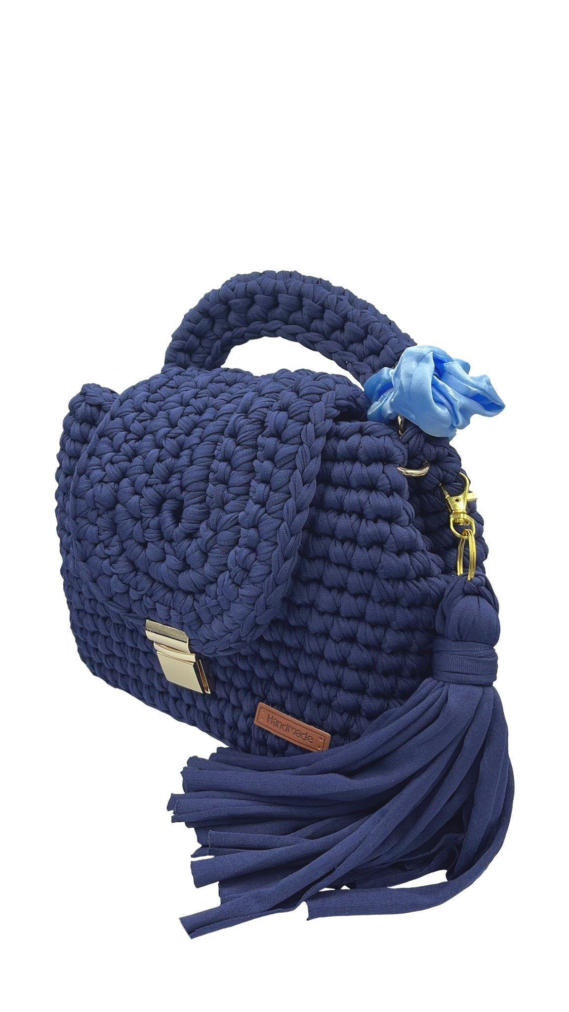 Looking for a stylish and sustainable accessory to add to your collection? Look no further than our Women's Handbags! This blue crossbody handbag, with its unique crochet design and recycled cotton yarn, is the perfect blend of style and sustainability.