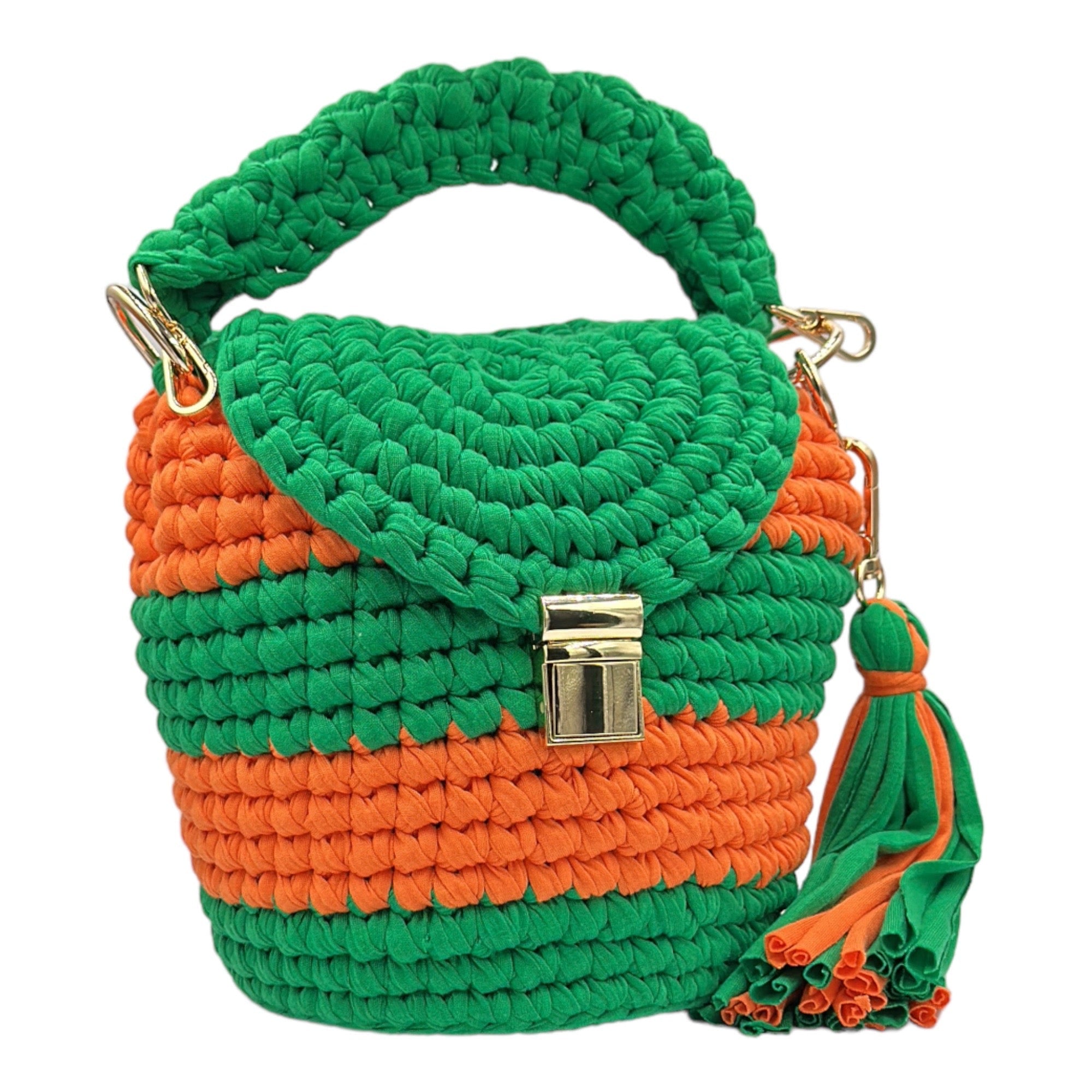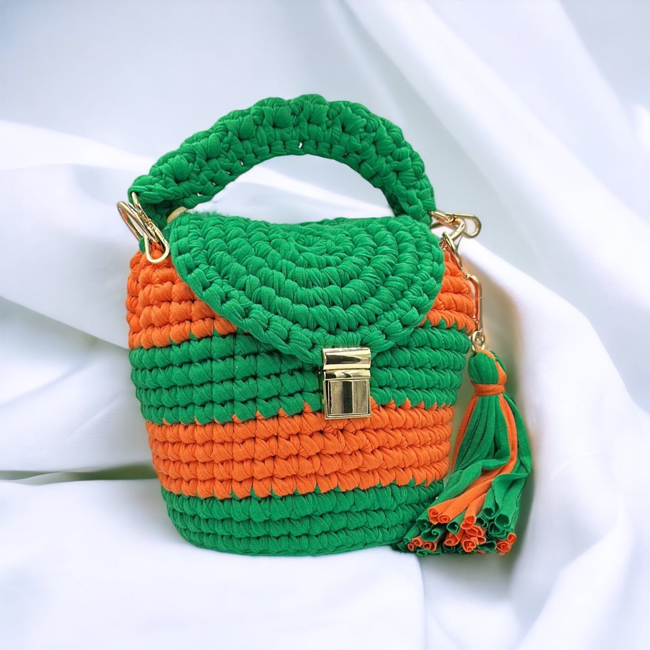 Introducing our Round bottom, Green/Orange Boho Crochet Women's Handbag, a stunning and eco-friendly accessory that is sure to turn heads. Handmade with love and care using 100% Recycled T-shirt Yarn, this handbag is not only fashionable but also environmentally conscious.